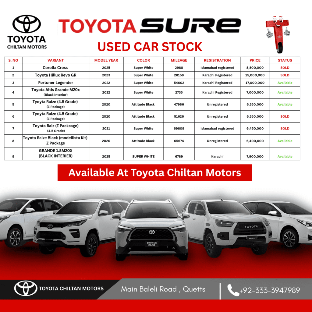 Up to 1 Year/15,000 KM OEM Warranty* which can be availed at any Toyota Dealership in Pakistan